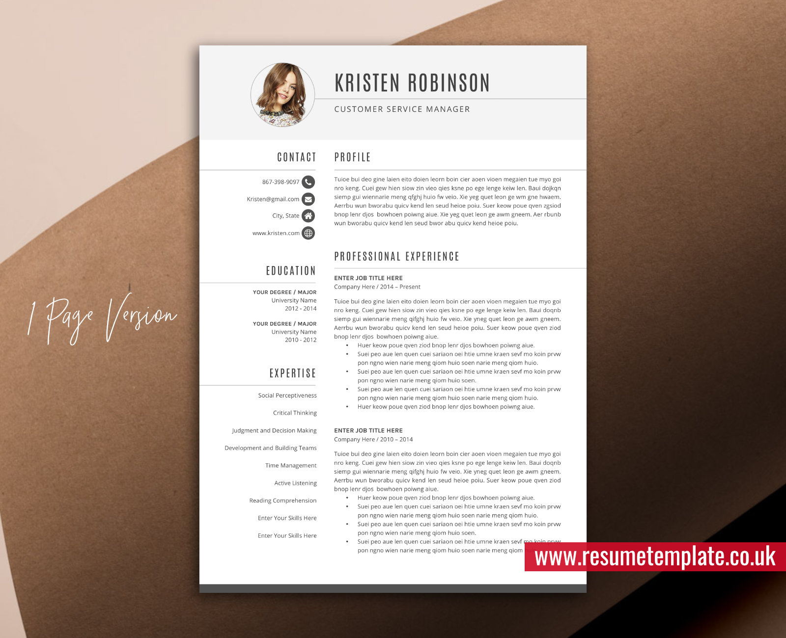 – 1 Page Resume Template in .docx format (A4 and US Letter).