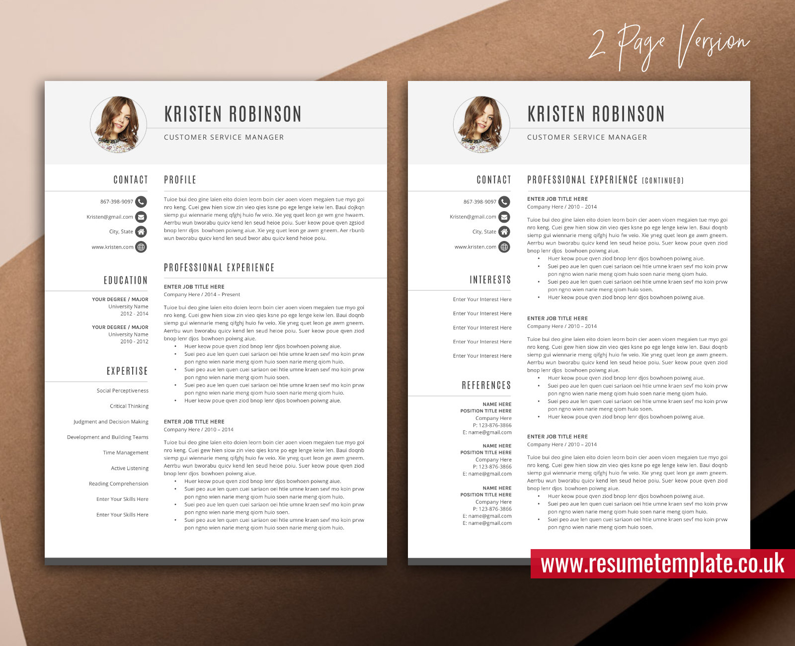 – 2 Page Resume Template in .docx format (A4 and US Letter).