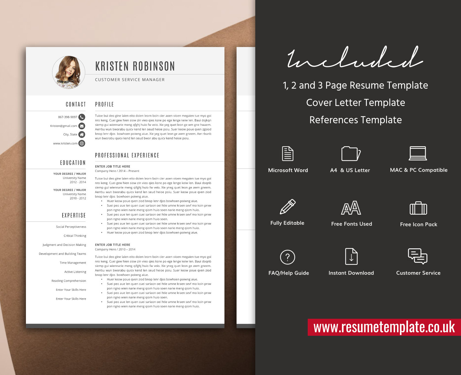 – 3 Page Resume Template in .docx format (A4 and US Letter).